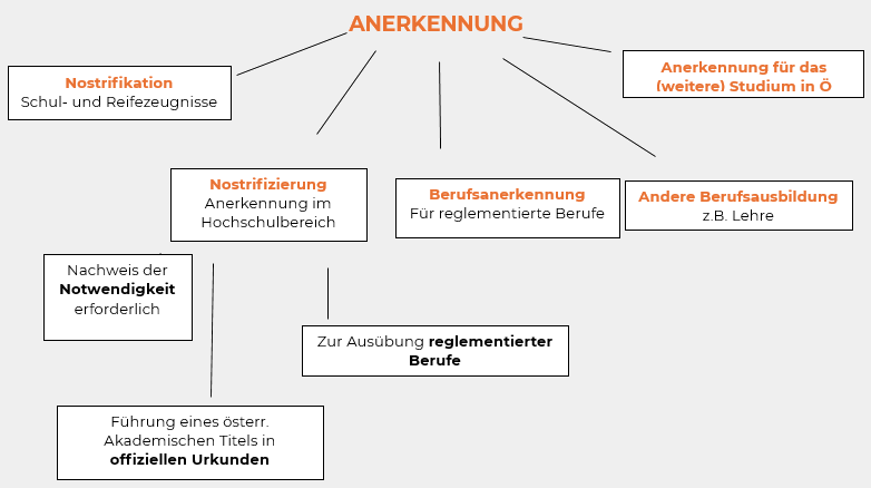 Bei den offiziellen Anerkennungen unterscheidet man zwischen Nostrifikation, Nostrifizierung, Berufsanerkennung, und Anerkennungen anderer Berufsausbildungen bzw. Anerkennungen für ein (weiteres) Studium in Österreich.