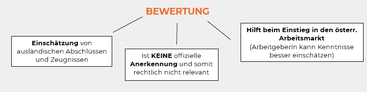 Bei Bewertungen handelt es sich um Einschätzungen bzw. grundsätzlichen Bewertungen der Vergleichbarkeit von ausländischen Abschlüssen und Zeugnissen mit jenen, die in Österreich ausgestellt werden. Diese können für Sie dann relevant werden, wenn in Ihrem Fall, keine Notwendigkeit einer Nostrifizierung besteht. Sie können beim Einstieg in den österreichischen Arbeitsmarkt durchaus hilfreich sein, da sie dem/der potenziellen ArbeitgeberIn die Einschätzung Ihrer Kenntnisse erleichtern kann.