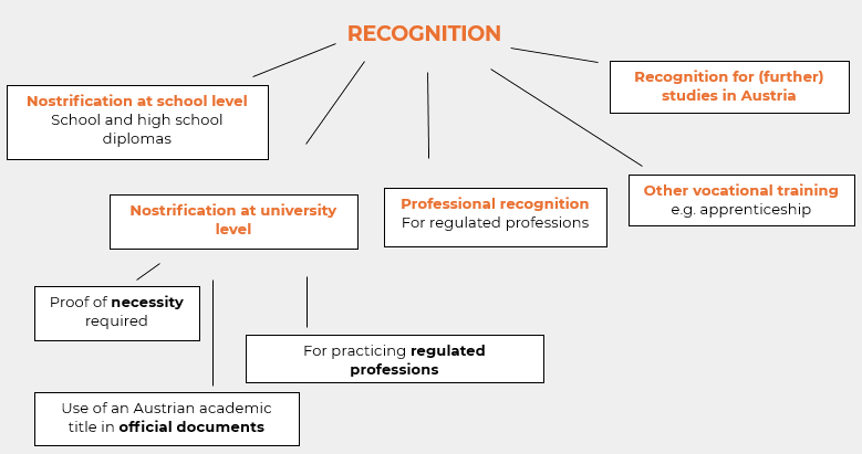 In the case of official recognition, a distinction is made between nostrification at university level, nostrification at school level, professional recognition and recognition of other professional qualifications or recognition for (further) studies in Austria.