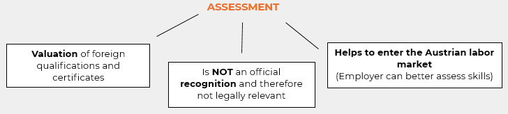 Assessments are basically evaluations of the comparability of foreign degrees and certificates with those issued in Austria. These may be relevant for you if there is no need for nostrification at university level in your case. They can be very helpful when entering the Austrian job market, as they can make it easier for potential employers to assess your knowledge.